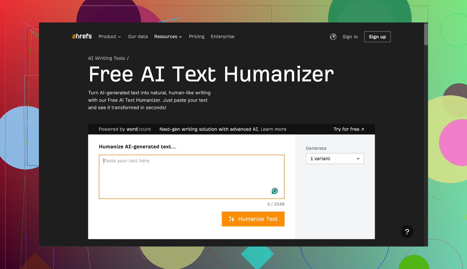 The humanizer lives inside Ahrefs’ Word Count platform.