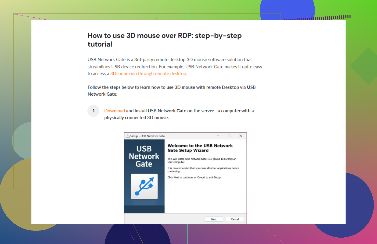 That page shows how to redirect a 3D mouse from your local PC into an RDP session using USB Network Gate, so your remote CAD workstation treats the 3D mouse like a local USB device.