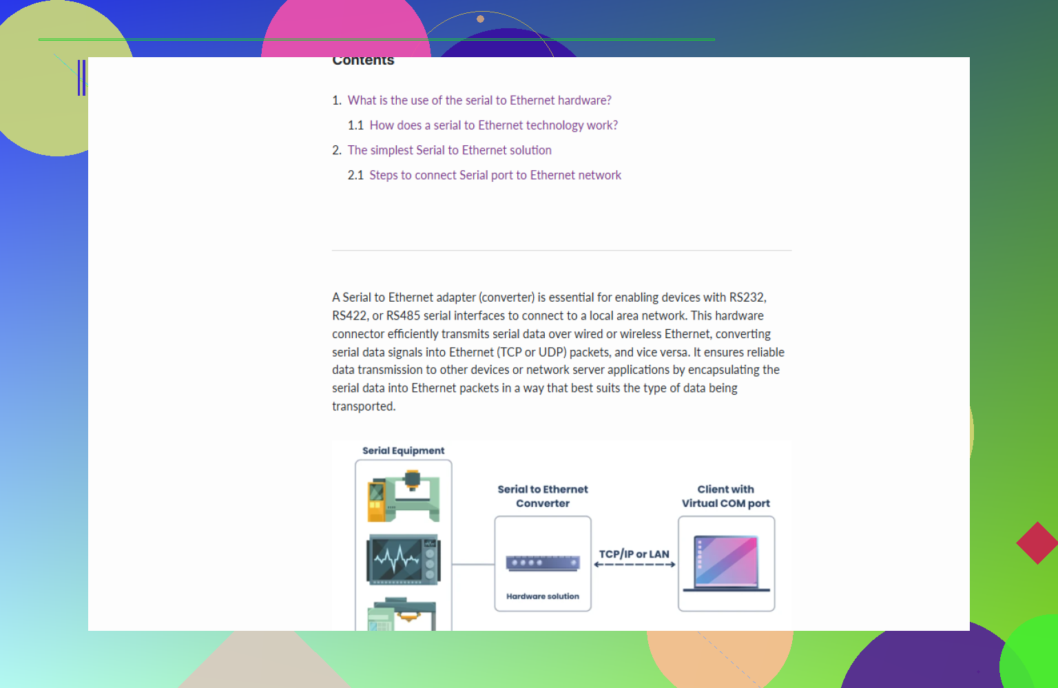 I’m trying to connect legacy serial devices to a modern Ethernet network and I’m confused by all the Serial to Ethernet technology options (device servers, converters, gateways, etc.). I’m not sure what hardware and protocols I actually need for reliable, low-latency communication and remote management. Can someone explain the practical differences, best practices, and what to watch out for so I don’t pick the wrong solution for my setup?