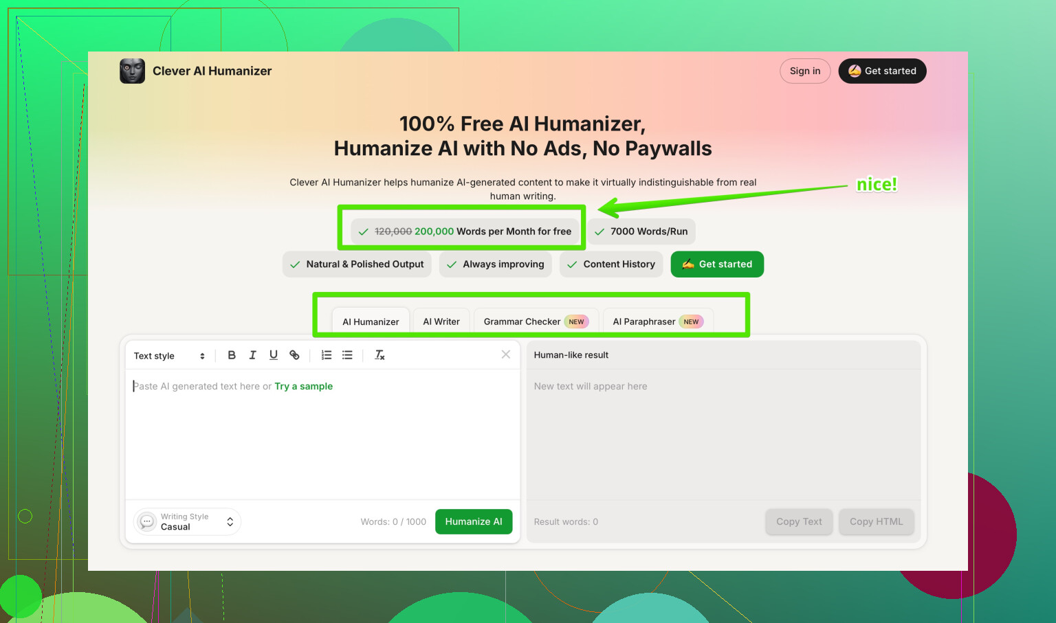 Their tool helps turn stiff AI drafts into more readable, conversational text, while still respecting context and meaning. Good for blog posts, emails, and simple SEO articles if you still do a human pass.