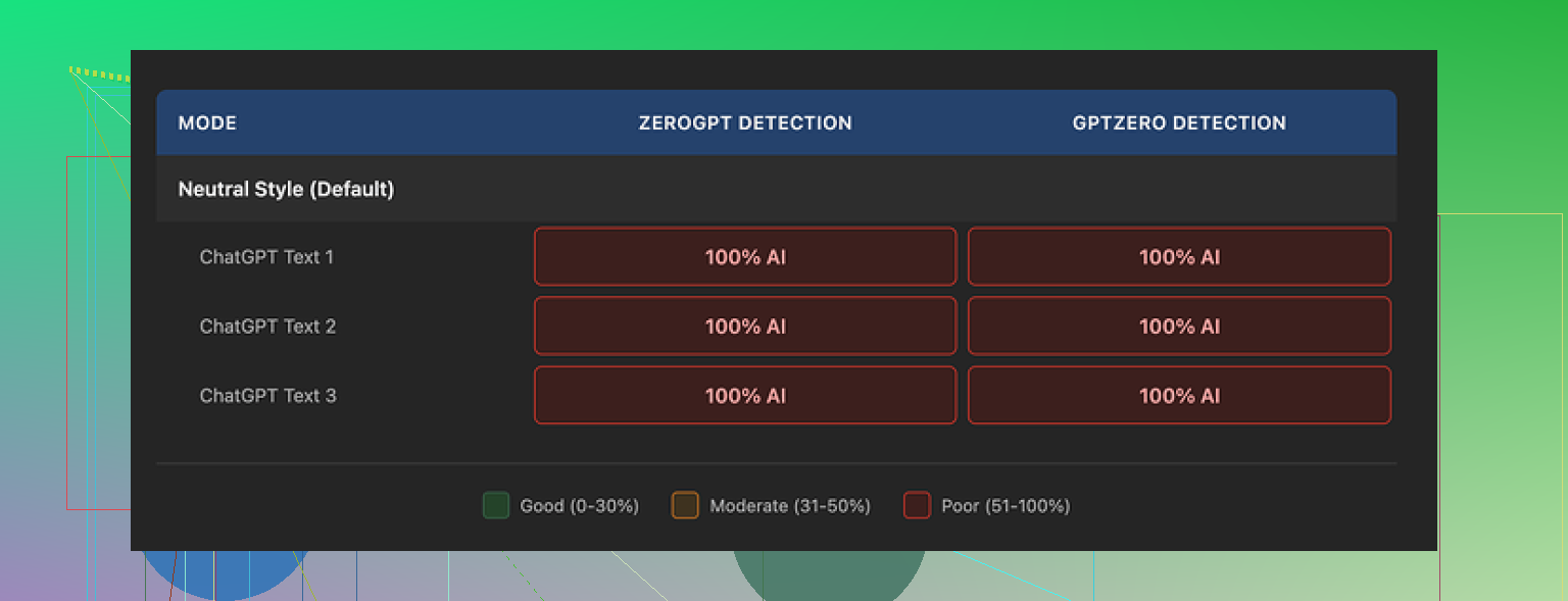 So in terms of bypass, at least with GPTZero and ZeroGPT, the score was 0 out of 10.