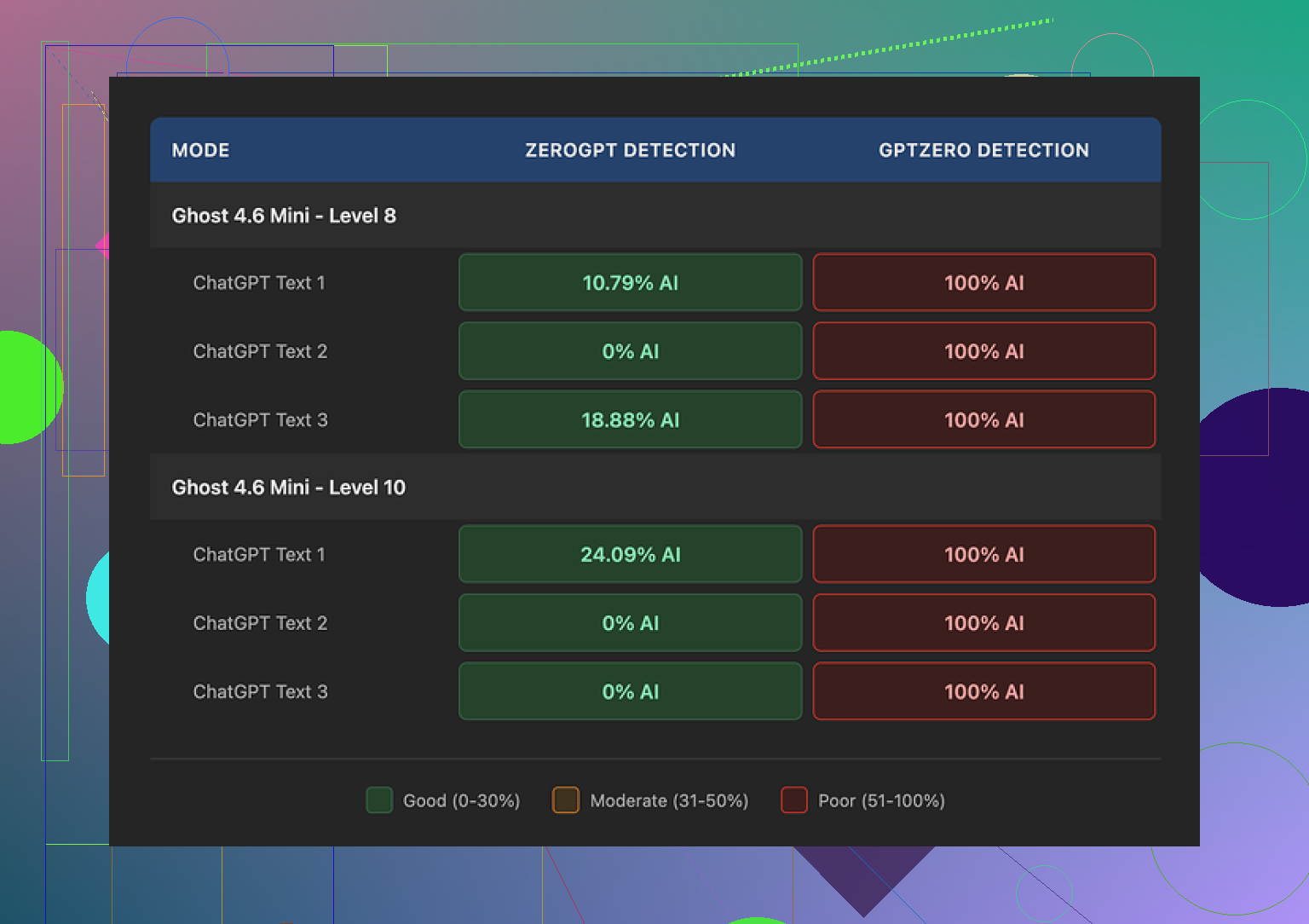 • On GPTZero, it went bad. Every single output showed as 100 percent AI, no matter what I tried. Ghost Mini, Ghost Pro, different styles, different intensities, shorter text, longer text. Always 100 percent.